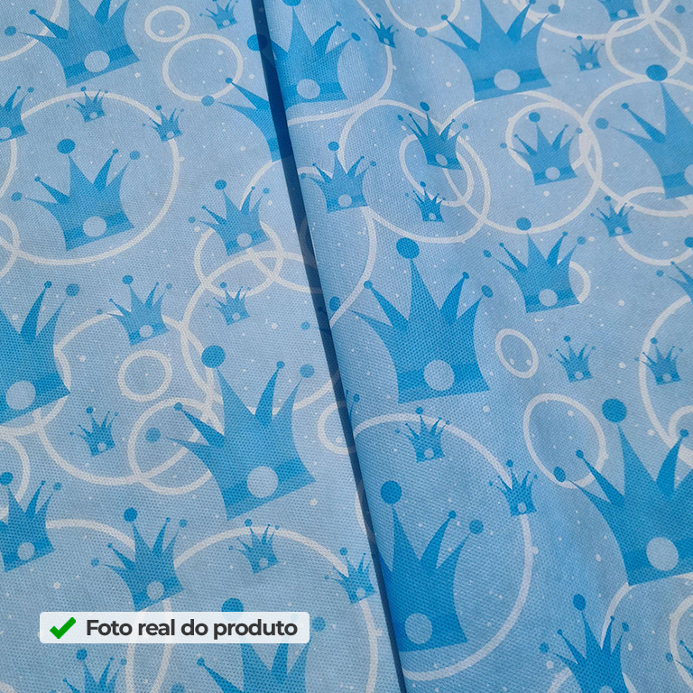 Quer criar uma decoração infantil com clima encantado, mas com um visual leve e bem organizado? O TNT Estampado Príncipe Azul traz uma estampa suave em tons de azul, com elementos em estilo fofo que remetem ao universo de príncipe, como detalhes decorativos e formas delicadas que deixam o fundo temático sem pesar. Assim, você monta um cenário clean e encantador, perfeito para aniversários infantis, mesversários, vitrines temáticas e festas com proposta “realeza” em azul.