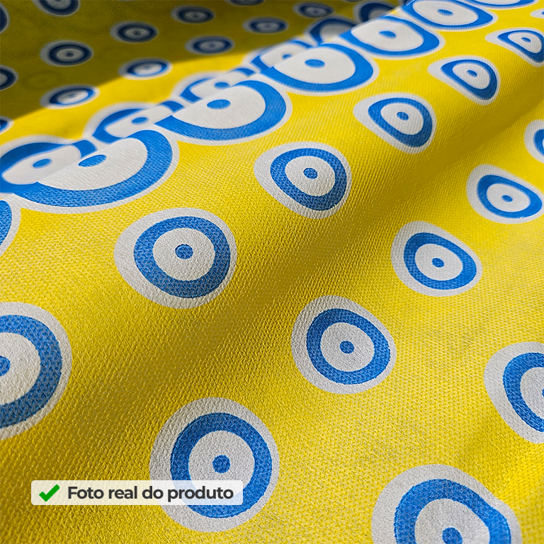 Quer um fundo diferente, com estética marcante e que destaque o cenário de longe? O TNT Estampado Olhos traz um padrão repetido de olhos em estilo “amuleto”, em azul e branco sobre fundo amarelo vibrante. Assim, você cria uma decoração moderna e cheia de energia, perfeita para vitrines criativas, festas temáticas, cenografias, painéis e composições tropicais ou mediterrâneas, onde cor e contraste fazem toda a diferença.